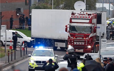 Ảnh 2: Cảnh sát áp tải chiếc xe đông lạnh đã bị phát hiện có chứa thi thể của 39 người Việt di cư tại Thurrock, miền nam nước Anh. Ảnh chụp ngày 23/10/2019. Nguồn ảnh: Alastair Grant/AP
